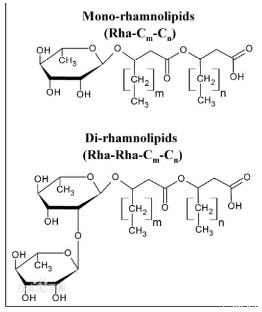 鼠李糖脂的結構多達幾十種,一般在學術界經常看到雙鼠李糖脂和單鼠李糖脂的表述。