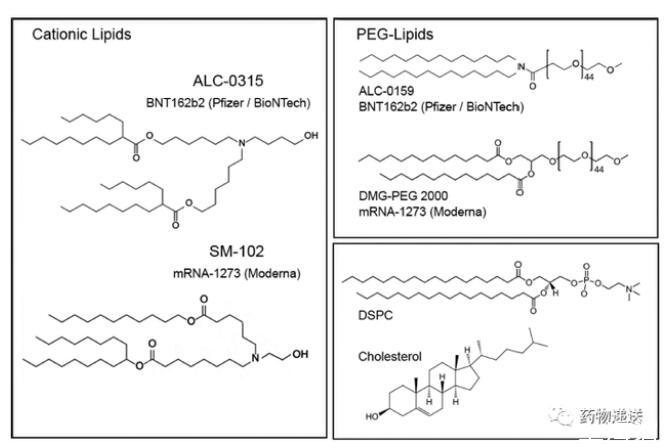 兩款mRNA疫苗采用的脂質(zhì)納米粒組成非常相似。都含有可電離的脂質(zhì),該脂質(zhì)在低pH值時帶正電利于與mRNA靜電作用絡(luò)合,在生理pH值時呈中性促進mRNA的遞送和釋放并減少潛在的毒性。都含有聚乙二醇化脂質(zhì),以減少血清蛋白的抗體結(jié)合和吞噬細胞的清除,從而延長全身循環(huán)時間。磷脂二硬脂酰磷脂酰膽堿(DSPC)和膽固醇形成穩(wěn)定結(jié)構(gòu)有助于包載mRNA。兩款疫苗的可電離陽離子脂質(zhì):PEG-脂質(zhì):膽固醇:DSPC的摩爾比分別為46.3:1.6:42.7:9.4(Pfizer/BioNTech)和50:1.5:38.5:10(Moderna)。脂質(zhì)納米粒的粒徑為80~100nm,每個脂質(zhì)納米粒中包含有約100個mRNA分子。