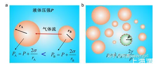 氣泡液體是大小不同的球狀氣泡分散到液體中的液氣體系。在氣泡液體中,大小不同氣泡是一個不穩(wěn)定的體系,其內部不等的壓強會使整個體系變化,總體趨勢是氣泡半徑出現(xiàn)粗化現(xiàn)象,這種粗化跟晶體生長中的Ostwald熟化的現(xiàn)象是一致的(Ref 1)。根據附加壓力公式,可知較小的氣泡其內部具有較大的壓強,因此與旁邊較大的氣泡間就會存在壓強差(圖1a),氣泡間液體兩側的壓強差會使氣體從壓強較大的地方向較小的地方擴散,從而出現(xiàn)大的氣泡增大,小的氣泡減小直至消失的情形,這就是氣泡Ostwald熟化的機理(Ref 2)。從能量的觀點來說,Ostwald熟化的結果降低了體系的表面能,從而使整個體系更加穩(wěn)定。