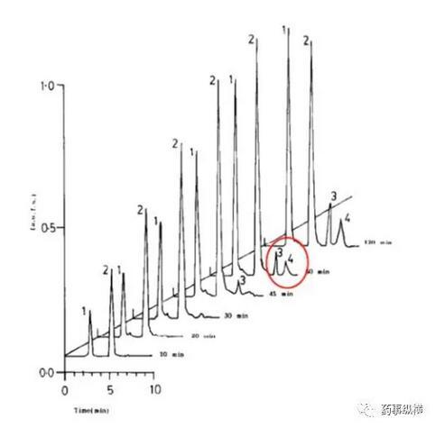 利福平在酸溶液中的降解情況(3、4為兩個降解物峰)