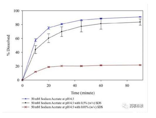 研究中發現,在含有低于CMC濃度的SDS的pH4.5介質中形成了不溶性鹽,影響了藥物的溶解度和制劑的潤濕性,而在高pH時這種現象不明顯。pH4.5介質中,當SDS濃度高于CMC濃度時,其溶出也比不加SDS的情況慢。