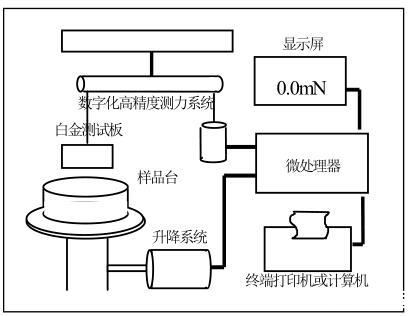 當白金板接觸到樣品液后,樣品液的表面張力會將白金板往下拉。基于高精度電子天平的數字化檢測系統檢測到這個微小的力并傳到微處理機進行處理。