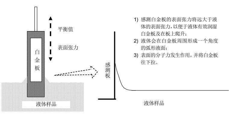 當感測白金板浸入到被測液體后,白金板周圍就會受到表面張力的作用,液體的表面張力會將白金板盡量地往下拉。當液體表面張力及其他相關的力與平衡力達到均衡時,感測白金板就會停止向液體內部浸入。這時候,儀器的平衡感應器就會測量浸入深度,并將它轉化為液體的表面張力值。