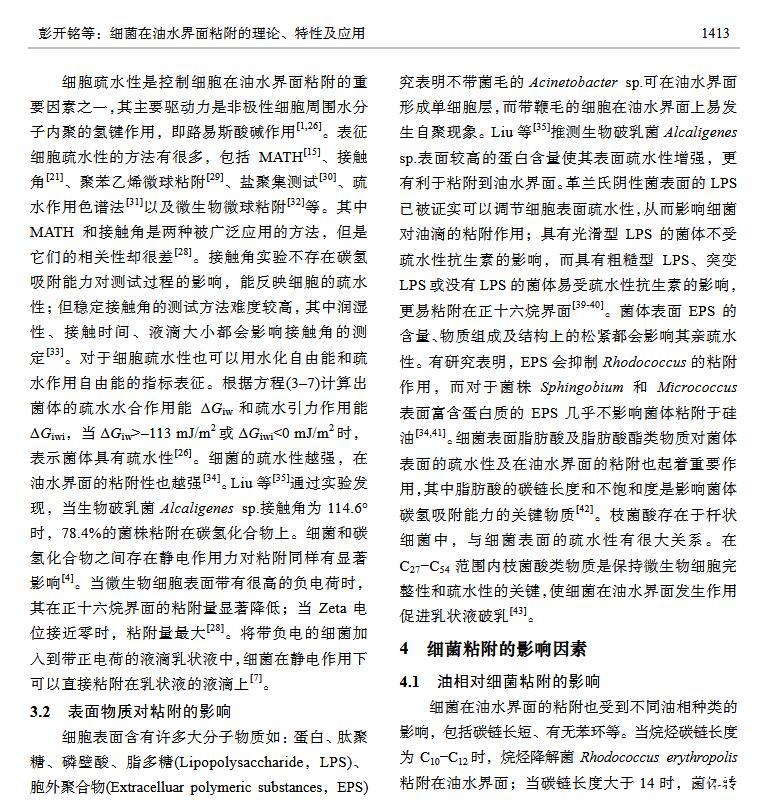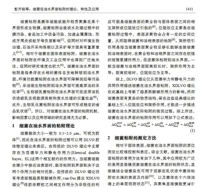 摘 要:細菌在油水界面粘附主要應用于烷烴污染的環境修復、石油開采與加工、食品加工等方面,其研究已經引起各界的廣泛關注。本文基于 XDLVO 理論闡述細菌在油水界面的粘附機理;總結細菌表面特性、油相及水相性質對細菌粘附的影響;介紹細菌粘附作用在微生物驅油、生物乳化與破乳以及烷烴降解方面的應用,并對今后的研究方向提出展望。