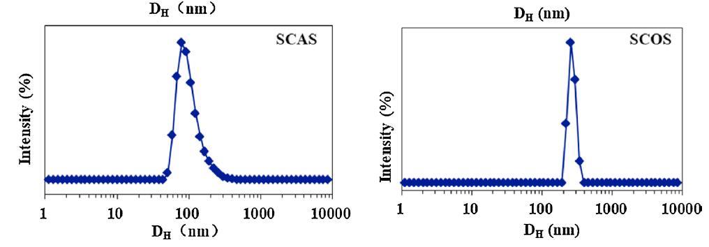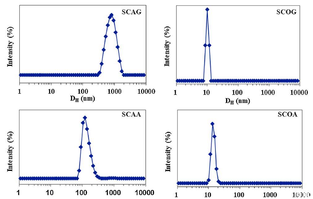 用DLS測(cè)量在6種酰基氨基酸表面活性劑水溶液中形成的聚集體的大小和分布,其CMC為5倍,5×CMC。圖2顯示了它們的表觀等效流體動(dòng)力學(xué)直徑(DH)。除絲氨酸外,蓖麻油表面活性劑的DH分布普遍大于棉籽油表面活性劑的DH分布。SCAG和SCAA的DH分布分別集中在900和150 nm,而SCOG和SCOA聚集體的直徑約為10 nm。對(duì)于絲氨酸,SCAS和SCOS的平均DH值分別約為100 nm和250 nm。這些結(jié)果可以通過蓖麻油衍生的表面活性劑的蓖麻油基和絲氨酸頭部基團(tuán)上都存在-OH基團(tuán)來解釋,促進(jìn)了大聚集體,例如囊泡的形成(圖2)。