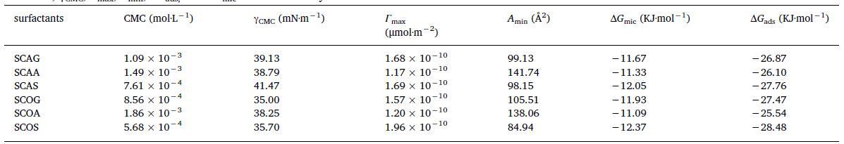 表1顯示合成表面活性劑的CMC值在0.568-1.86 mM范圍內(nèi)。與其他表面活性劑相比,帶有最疏水丙氨酸殘基的表面活性劑(SCAA和SCOA)具有相對(duì)較高的CMC。SCAA頭部區(qū)域的強(qiáng)疏水性和SCOA可能會(huì)阻礙膠束界面區(qū)域的水/頭基相互作用,從而增加它們的CMC。γCMC的值在35.00到41.47 mN·m-1之間,棉籽油衍生的表面活性劑的γCMC值普遍低于衍生的表面活性劑的γCMC值來自具有相同頭部基團(tuán)的蓖麻油。SCOS獲得了最高Γmax值和最低Amin值,表明在其頭部基團(tuán)上帶有-OH基團(tuán)的SCOS單體在空氣/水界面上更緊密地堆積。鑒于蓖麻油衍生的表面活性劑疏水尾部存在-OH基團(tuán),我們得出結(jié)論,頭部基團(tuán)上的-OH基團(tuán)與尾部的表現(xiàn)不同。所有表面活性劑的ΔGmic和ΔGads的負(fù)值意味著兩者在水中的膠束化在298.15 K下,空氣/水界面處的吸附是自發(fā)過程。對(duì)于SCOS也獲得了最大的ΔGads和ΔGmic絕對(duì)值,表明絲氨酸殘基上的-OH基團(tuán)有助于膠束化和吸附。
