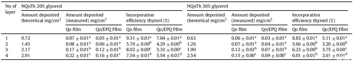 表3注射到薄膜Qo和Qo/EPQ中的百里酚量(mg/cm3)作為印刷次數(shù)的函數(shù)。不同字母表示顯著差異(p<0.05)。