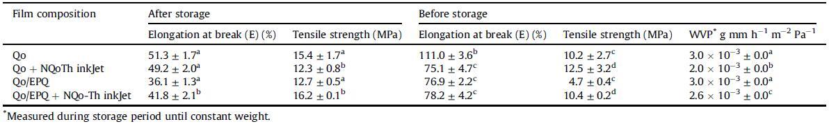 在儲存前后測量了印有4層NQoThs的薄膜的機(jī)械性能和WVP,這些結(jié)果如表4所示。