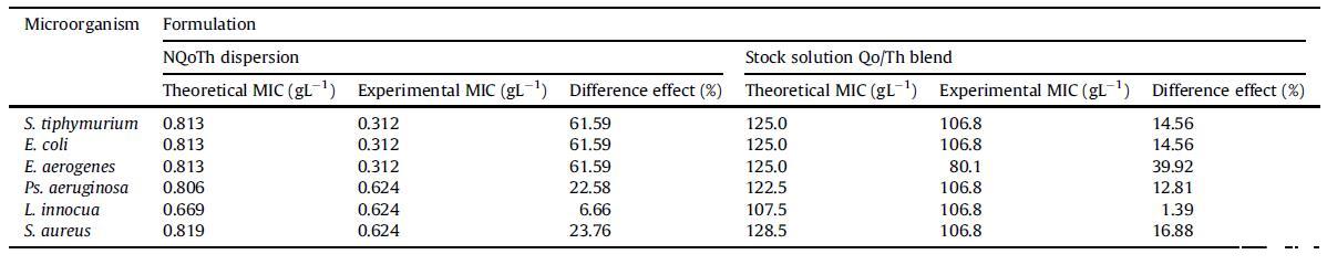 表5儲備溶液NQoTh和Qo/Th混合物的分散對本研究中使用的微生物的添加劑或協(xié)同效應(yīng)的定量評估。