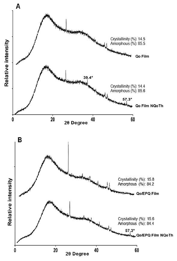 圖4.(A)Qo薄膜控制和Qo NQoTh 11薄膜和(B)Qo/EPQ薄膜控制和Qo/EPQ NQoTh薄膜的X射線衍射曲線和結(jié)晶度(%)。
