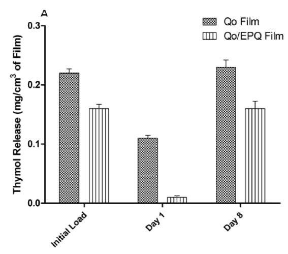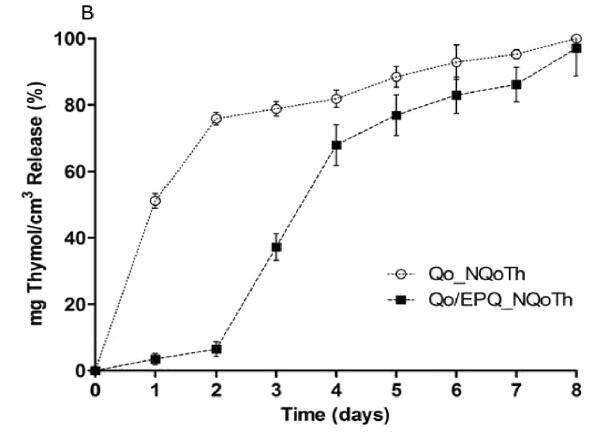 圖6.從使用NQoTh印刷4次的薄膜Qo和Qo/EPQ中釋放百里酚(A)0天(初始負(fù)載Th)、第1天和第8天的釋放曲線和(B)室溫下8天測定的百里酚釋放動力學(xué)溫度。