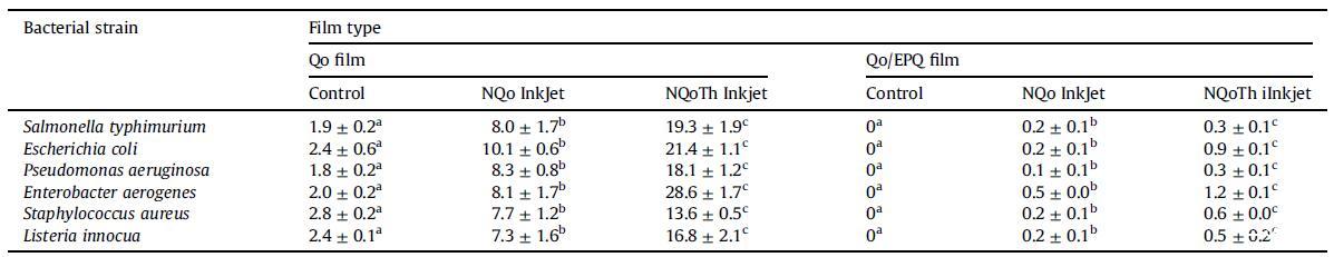 表6通過熱噴墨將NQo和NQoTh結(jié)合到Qo和Qo/EPQ薄膜中的徑向擴(kuò)散的生長抑制區(qū)(mm2)。對于每種納米顆粒溶液,薄膜印刷4次。不同字母表示顯著差異(p<0.05)。