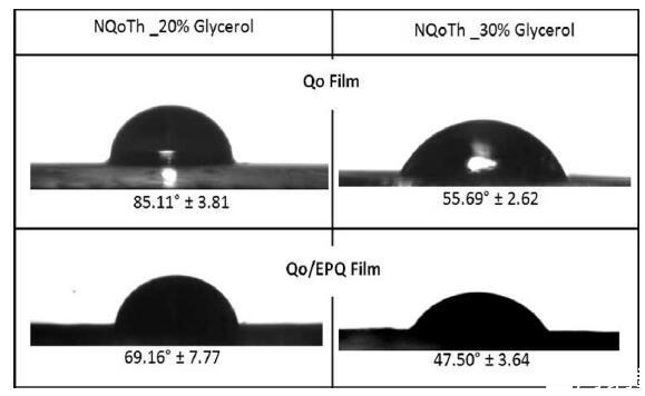 圖2.在Qo膜(上)和Qo/EPQ(下)之間由添加了20%和30%(v/v)的甘油的液滴NQoTh分散體形成的接觸角。