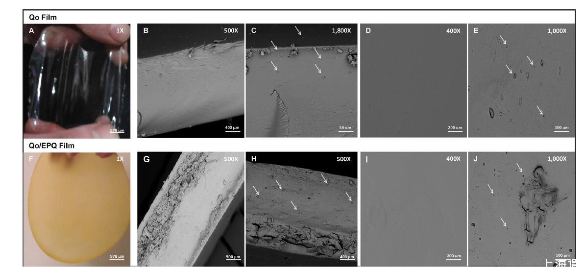 Qo和Qo/EPQ的印刷膜示于圖3A和F。圖3B示出了Qo膜的橫截面,圖3G示出了EPQ/Qo膜的橫截面。Qo膜具有均勻、柔軟、光滑、連續(xù)的結(jié)構(gòu),具有良好的完整性和孔隙。相比之下,混合膜具有帶有孔隙和裂縫的異質(zhì)結(jié)構(gòu)。Qo-乳清蛋白薄膜(Kurek、Galus和Debeaufor,2014年)和Qo-明膠薄膜(Kurek等人,2012年;Rivero、García和Pinotti,2009年;Torres、Aimoli、Beppu和弗雷利希,2005年)。這些作者將這些由碳水化合物和蛋白質(zhì)混合物制備的薄膜的異質(zhì)結(jié)構(gòu)歸因于干燥過程(溶劑前沿的遷移)。Qo/EPQ薄膜的干燥時間是Qo薄膜的1.8倍,表明水分子通過混合薄膜的擴(kuò)散速度較慢。此外,混合物的pH值(pH 3.8)接近藜麥蛋白的等電點(Abugoch,Romero,Tapia,Rivera,&Silva,2008),這可能會引發(fā)復(fù)雜的凝聚和某些蛋白質(zhì)組分的沉淀,導(dǎo)致Ferreira等人描述的熱力學(xué)不相容性。(2009),當(dāng)乳清蛋白和Qo的混合物被酸化以獲得混合膜時,他觀察到了這種現(xiàn)象。