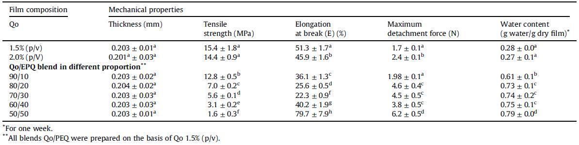 表1殼聚糖薄膜(Qo)和Qo/EPQ混合物(Qo/EPQ)薄膜的機(jī)械性能。不同字母表示差異顯著(p<0.05)。