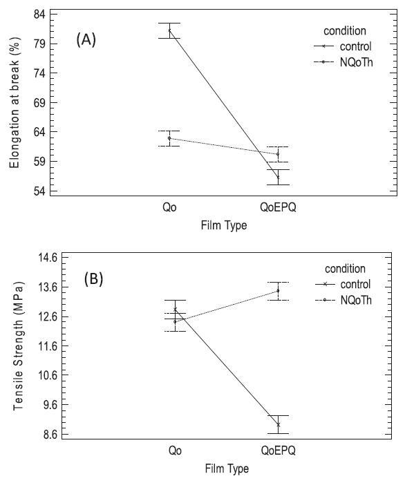 圖5.Type Film和NQoTh之間的相互作用(A)斷裂伸長率效應(yīng)和(B)拉伸強(qiáng)度效應(yīng)。