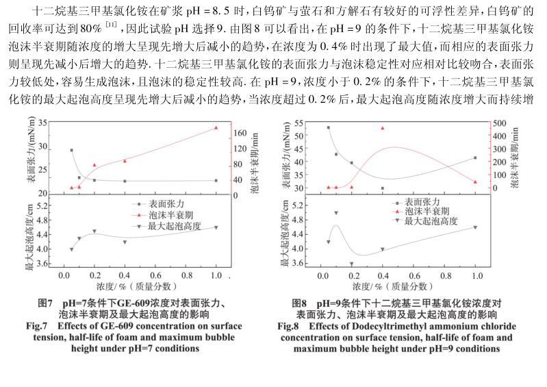 【摘要】:研究了不同pH和濃度對四種陽離子捕收劑表面張力以及起泡性能的影響.通過控制單因素變量,結合表面張力以及臨界膠束濃度的相關理論,采用KRUSS表面張力儀等設備研究了陽離子捕收劑的表面張力與起泡能力、泡沫穩定性之間的關系。結果表明,pH值對十二胺、N-十二烷基乙二胺兩種捕收劑的表面張力影響較明顯,對GE-609(醚胺化合物)及十二烷基三甲基氯化銨的影響較小;濃度對四種捕收劑的表面張力及泡沫穩定性都存在一定的影響,但影響程度不同,對起泡能力的影響不明顯,但總體呈上升趨勢。捕收劑的泡沫穩定性與表面張力存在一定關系,當濃度小于臨界膠束濃度時,表面張力越大,泡沫穩定性越弱,起泡能力隨濃度的變化存在一定波動,但變化趨勢與表面張力沒有直接的對應關系。