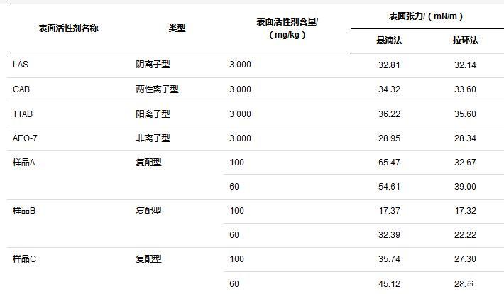 對(duì)于溶液而言,表面活性劑的存在能顯著降低表面張力,本文研究了不同表面活性劑溶液,同一含量下,兩種方法測(cè)試結(jié)果的差異以及同一表面活性劑溶液,不同含量下兩種方法測(cè)試結(jié)果的差異。所有方法按規(guī)范操作執(zhí)行,測(cè)試溫度25℃,平行測(cè)定5次取算數(shù)平均值,比較結(jié)果如表2所示。