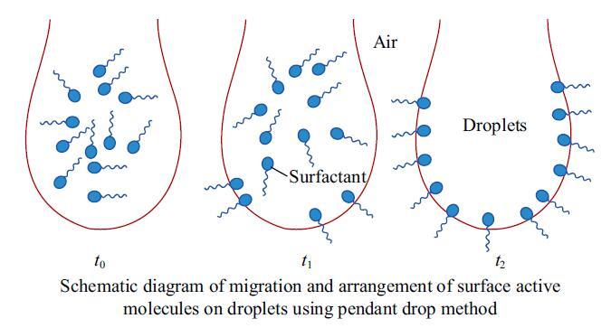 結(jié)果表明,在動(dòng)態(tài)表面張力曲線(xiàn)圖中,A,B,C三種樣品在60 mg/kg的較低含量下,表面張力均呈現(xiàn)先快速降低而后緩慢降低最終達(dá)到平衡的趨勢(shì),表明表面活性劑分子在液滴表面上確實(shí)存在著隨時(shí)間變化逐漸吸附平衡,排列完整的現(xiàn)象,如圖4所示,表面活性劑分子在表面完全吸附、排列緊密需要一定的時(shí)間,顯然在使用懸滴法進(jìn)行測(cè)定時(shí),時(shí)間效應(yīng)直接影響著表面張力測(cè)定的誤差大小,符合前文所述結(jié)論。而樣品B在100 mg/kg含量下,動(dòng)態(tài)表面張力趨勢(shì)圖成一條直線(xiàn),證明該種表面活性劑在液滴表面遷移速度較快,在液滴完全注射形成之前已快速到達(dá)平衡狀態(tài),表面活性劑分子在表面得以充分排布,這解釋了較低含量的表面活性劑溶液的靜態(tài)表面張力與國(guó)標(biāo)推薦方法吻合程度差異較大的原因。這是由表面活性劑分子自身性質(zhì)所決定的,與其極性基的類(lèi)型、結(jié)構(gòu)、個(gè)數(shù)、疏水基長(zhǎng)度等息息相關(guān)。而單一液體,未具有含量差,故不存在表面活性劑分子從溶劑內(nèi)部遷移吸附至表面這一過(guò)程,所以其動(dòng)態(tài)表面張力曲線(xiàn)呈現(xiàn)為平穩(wěn)直線(xiàn)。