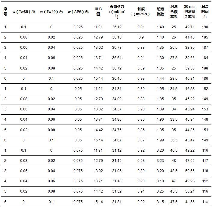 選用非離子-非離子表面活性劑復配體系,以吐溫85(Tw85)、吐溫40(Tw40)、烷基糖苷(APG)復配組分作為實驗對象,實驗中發現Tw85和Tw40混合溶液無法產生穩定泡沫,因此將Tw85和Tw40復配組分作為HLB值調節組分,添加APG作為輔助起泡劑。實驗結果見表1。