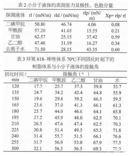 表2為實驗所用小分子液體的表面張力及極性、色散分量,表3為環氧618-咪唑體系70℃不同固化時刻下的樹脂體系與小分子液體的接觸角。