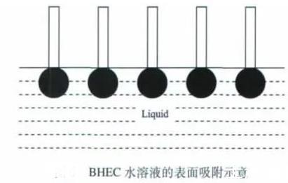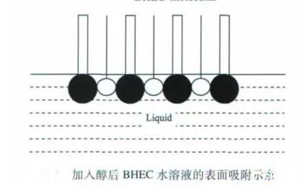 乙醇和正丁醇屬于一元醇,這兩種醇的加入能使BHEC水溶液的表面張力減小。當未加入一元醇時,BHEC溶于水后,BHEC分子能自發地吸附在溶液的表面,使溶液的表面張力降低,表面吸附的BHEC分子越多,溶液表面張力的降幅越大,當然這其中有一個吸附飽和的問題。但由于BHEC分子在水中處于空間交聯網絡結構,其定向排列時分子間存在一定的空間(見上圖)。加入乙醇或正丁醇后,醇分子可以插入BHEC分子間的空隙,使溶液表面吸附的分子達到緊密排列的狀態(見下圖),導致BHEC水溶液的表面張力繼續降低。