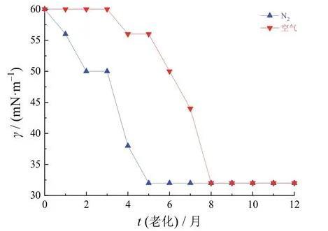 將納米涂層放置在室溫條件下自然老化12個月,每隔一個月測試一次表面張力。由圖2可知,老化前涂層的表面張力均為60 mN/m,其中,空氣條件下等離子處理的涂層的表面張力在前3個月內無變化,4個月后降為56 mN/m且保持了1個月左右,6個月后降為50 mN/m,7個月后降為45 mN/m,8個月后降幅最大,降至僅有32 mN/m,之后的4個月基本保持在這一水平。對于以氮氣為氣源等離子處理的涂層,其表面張力在1個月后降為56 mN/m,2個月后降為50 mN/m且保持了1個月左右,4個月后降幅最大,降至38 mN/m,5個月后再降至32 mN/m,之后的7個月基本保持在這一水平。納米涂層以空氣等離子處理后的表面張力在前8個月的下降幅度明顯小于氮氣等離子處理的涂層。根據行業經驗,涂層要滿足粘接性能的話,其表面張力一般需要≥34 mN/m,≥38 mN/m則幾乎可以滿足所有粘接需求。以空氣作為氣源等離子處理后的7個月內涂層的表面張力仍大于40 mN/m,因此可以滿足實際應用需求,而且優于以氮氣作為氣源的處理效果。