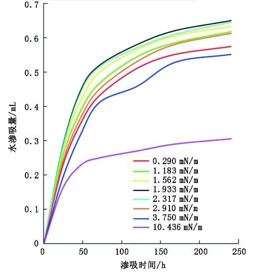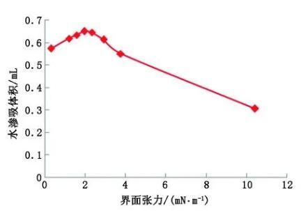 圖2界面張力對最終水滲吸體積的影響(試驗結(jié)果)