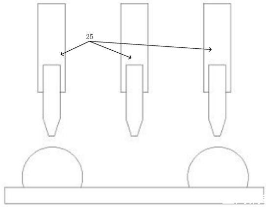 步驟S3:通過印刷機(jī)構(gòu)將摻入碳粉并通入正電荷的UV油墨鋪滿在紙張上,由于紙張上已覆蓋有固化的UV涂層,因此UV油墨在紙張上仍可自由移動(dòng),此時(shí)通過計(jì)算機(jī)處理印刷圖案,進(jìn)而控制印刷機(jī)構(gòu)向指定金屬探針輸送負(fù)電荷,其余金屬探針輸送正電荷,當(dāng)金屬探針接觸帶正電荷UV油墨時(shí),通過異電荷相互吸附的原理,UV油墨將向金屬探針聚攏;其余探針通過同電荷相互排斥的原理,UV油墨將向金屬探針反方向逃逸,待金屬探針收回,UV油墨將因表面張力短時(shí)間內(nèi)無法流平,再對(duì)紙張表層所有UV油墨進(jìn)行最終固化;