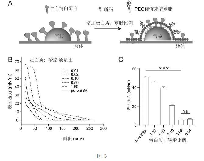 不同蛋白質與磷脂質量比對氣液界面表面張力調控效應圖:A為牛血清白蛋白與磷脂在氣液界面組裝的示意圖;B為不同蛋白質與磷脂質量比的氣液界面表面壓力與面積等溫曲線圖;C為不同蛋白質與磷脂質量比的表面張力值;